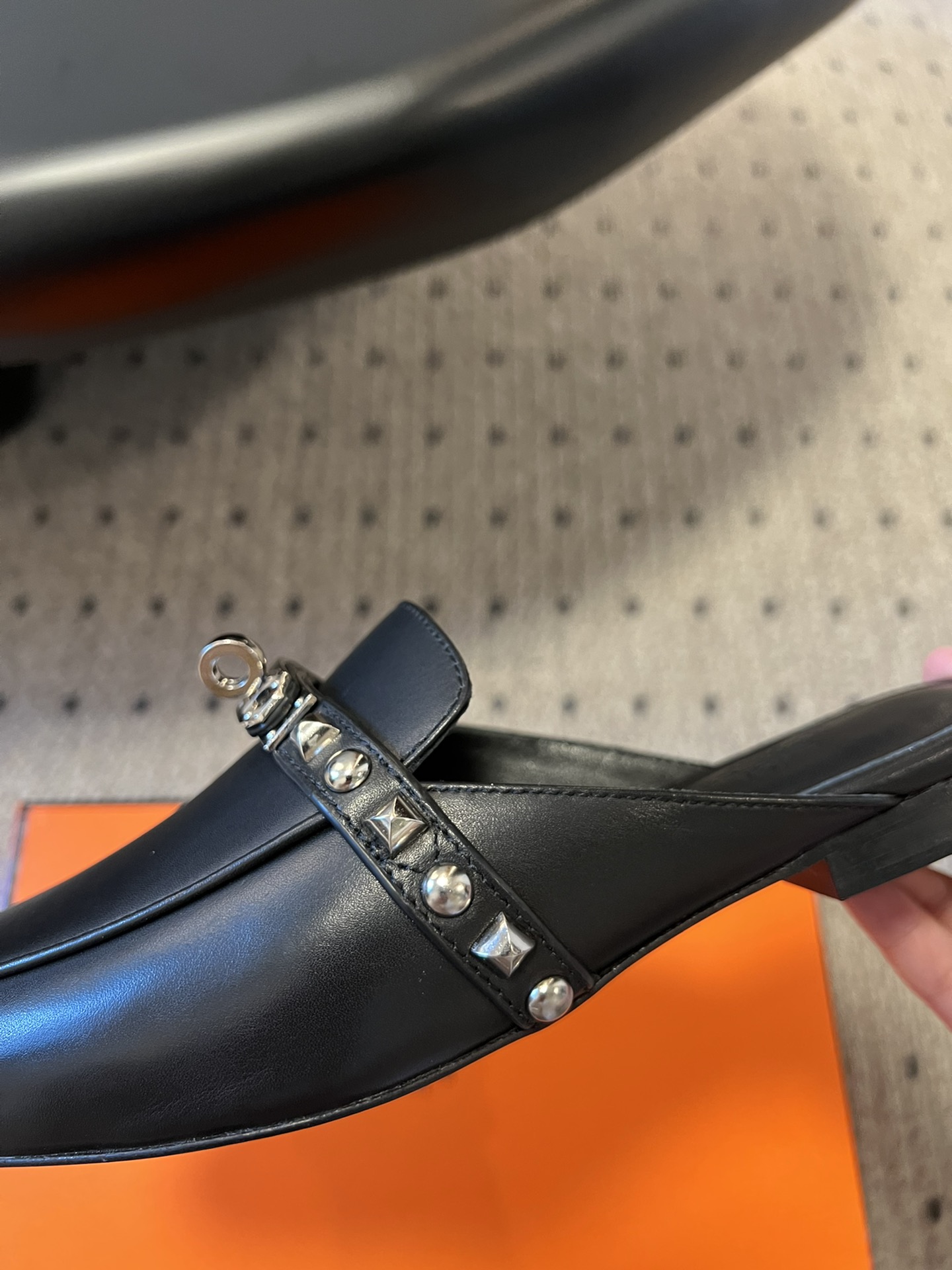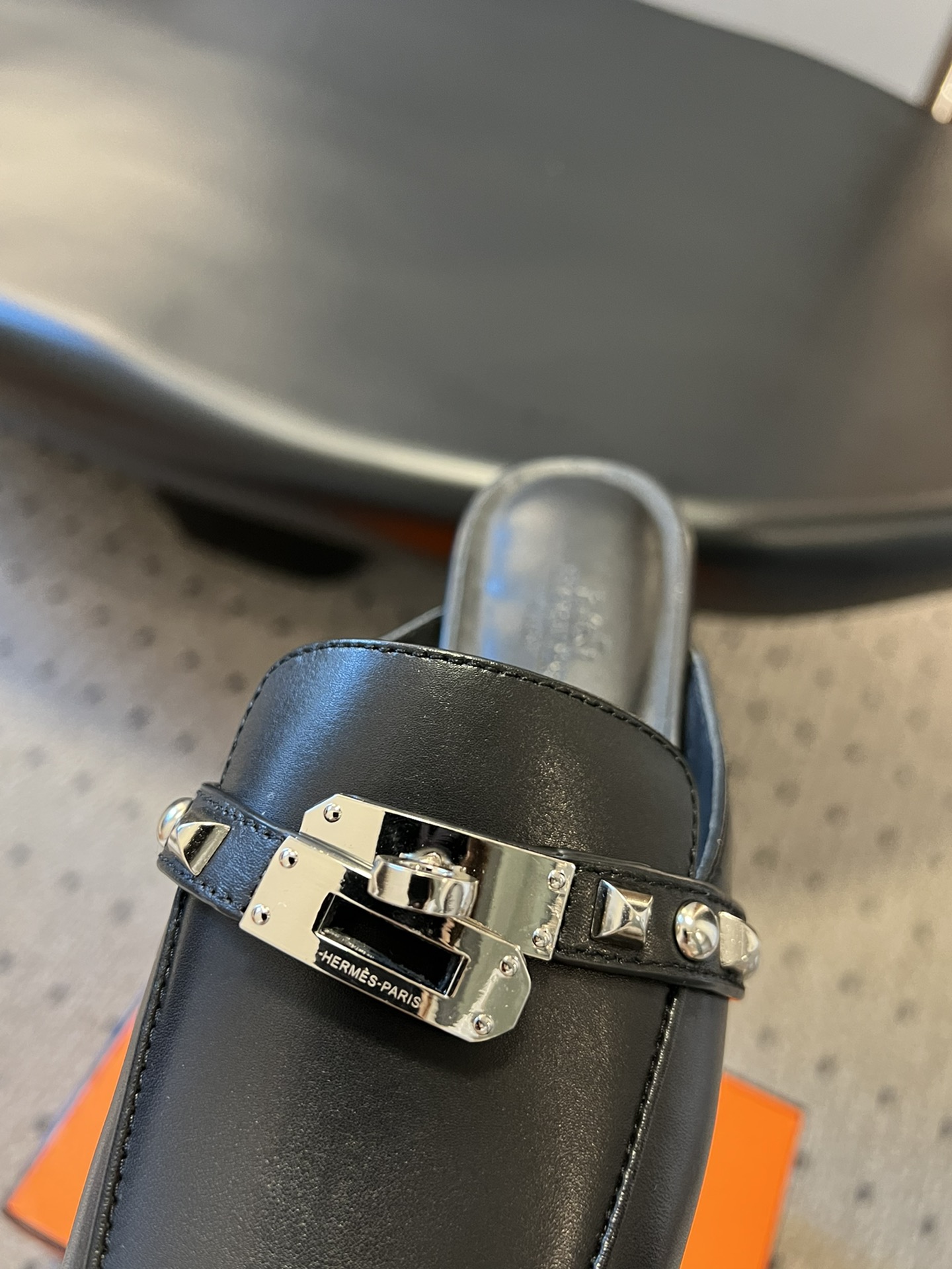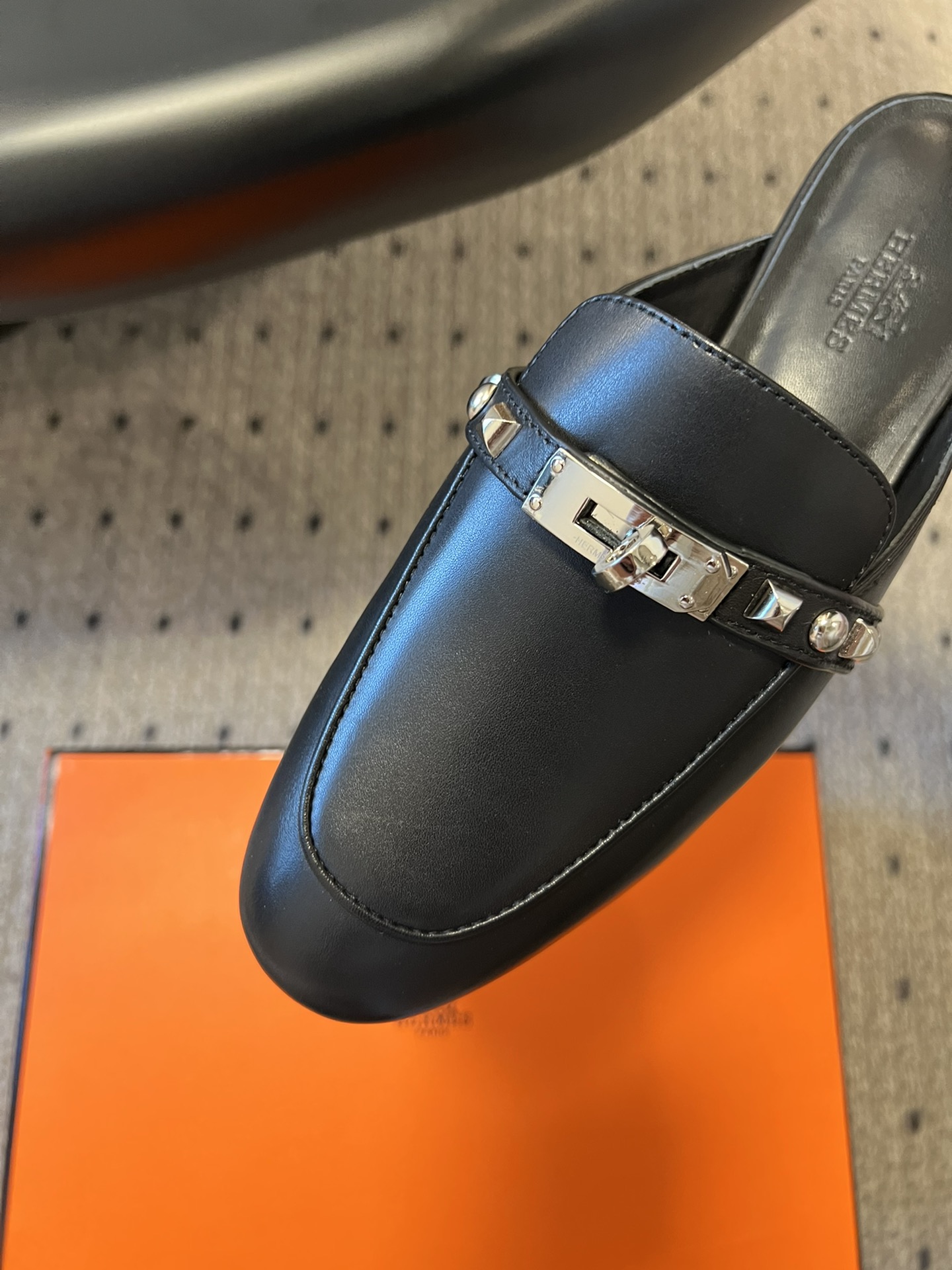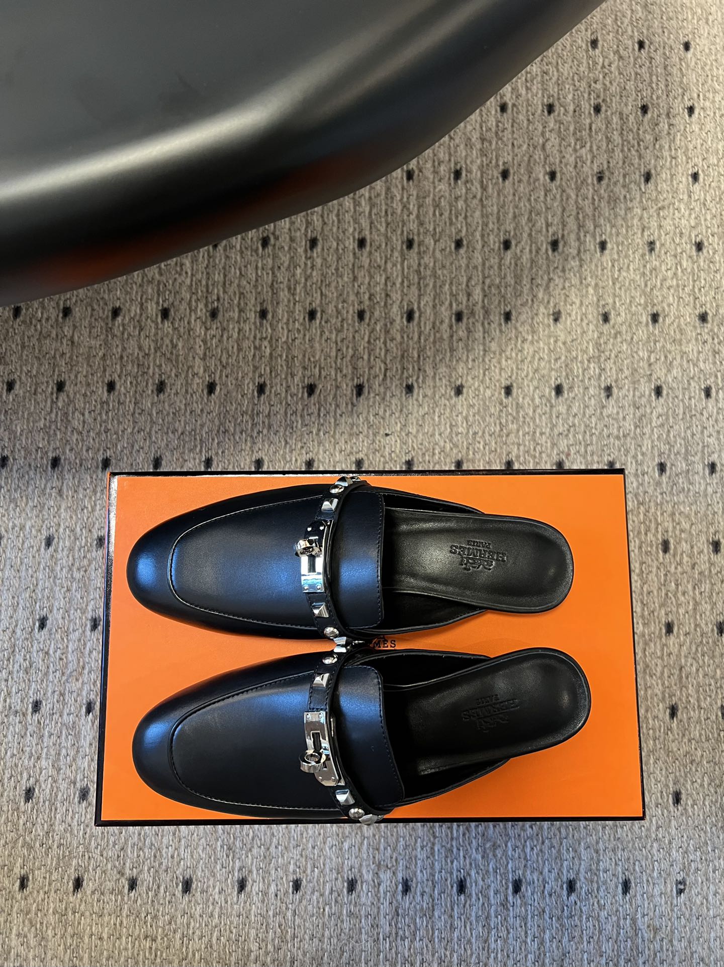 he Hermès Mule Femme OZ in Chevre Noir with Clous Medor is a luxurious slip-on loafer crafted from premium black goatskin leather. It features the iconic Medor studs, adding a bold yet refined touch to the design. This style is part of Hermès’ exclusive offerings, combining classic elegance with contemporary edge.