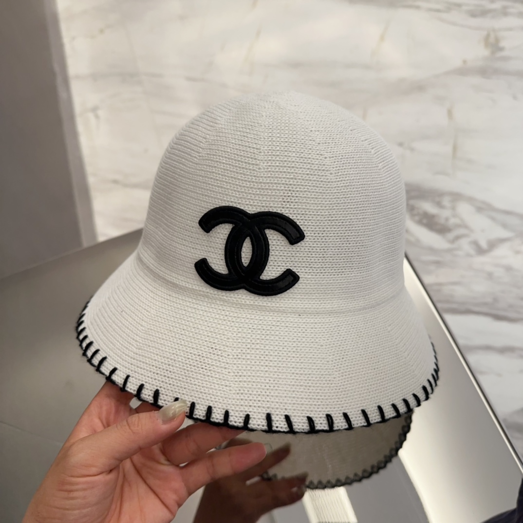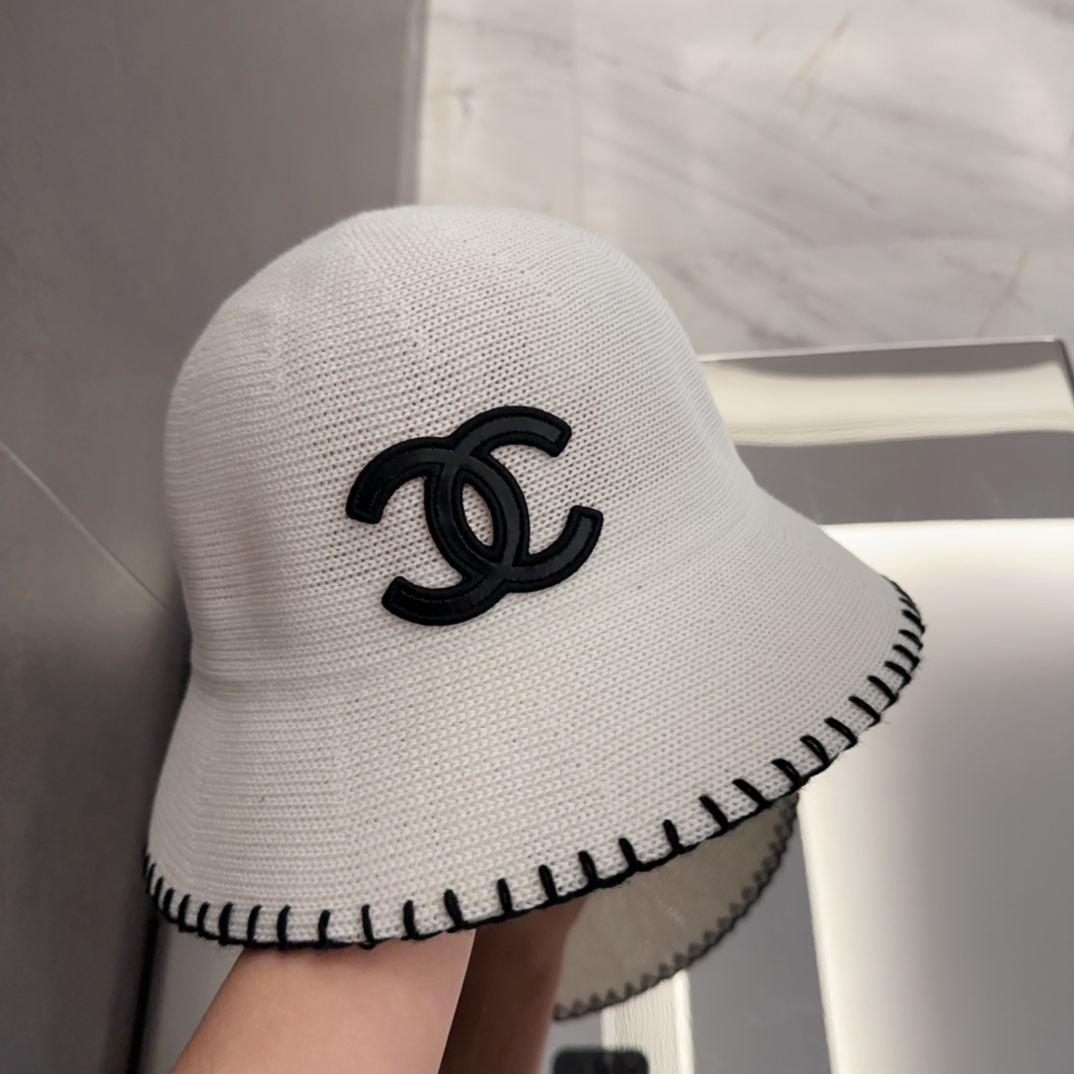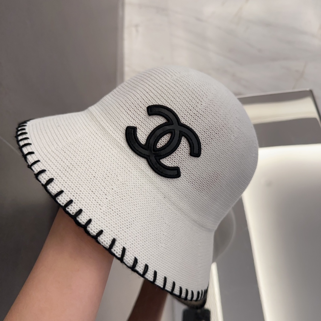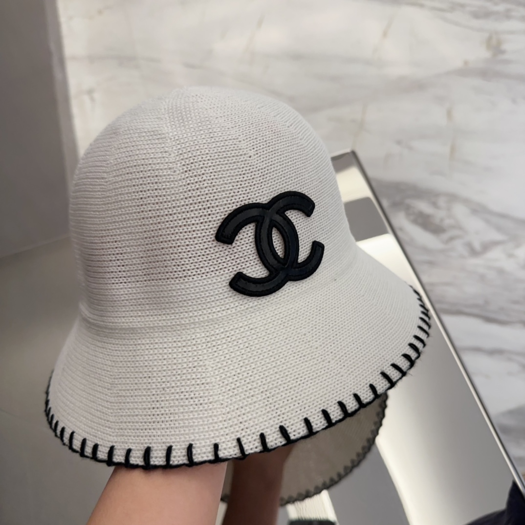 Chanel White Crochet Bucket Hat with Black Embroidered Logo and Edging